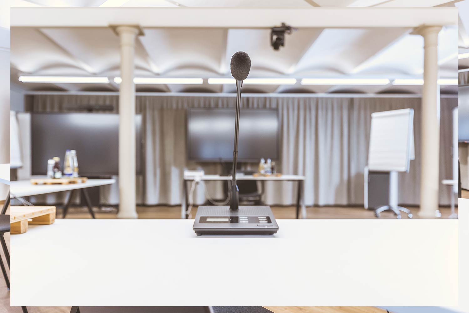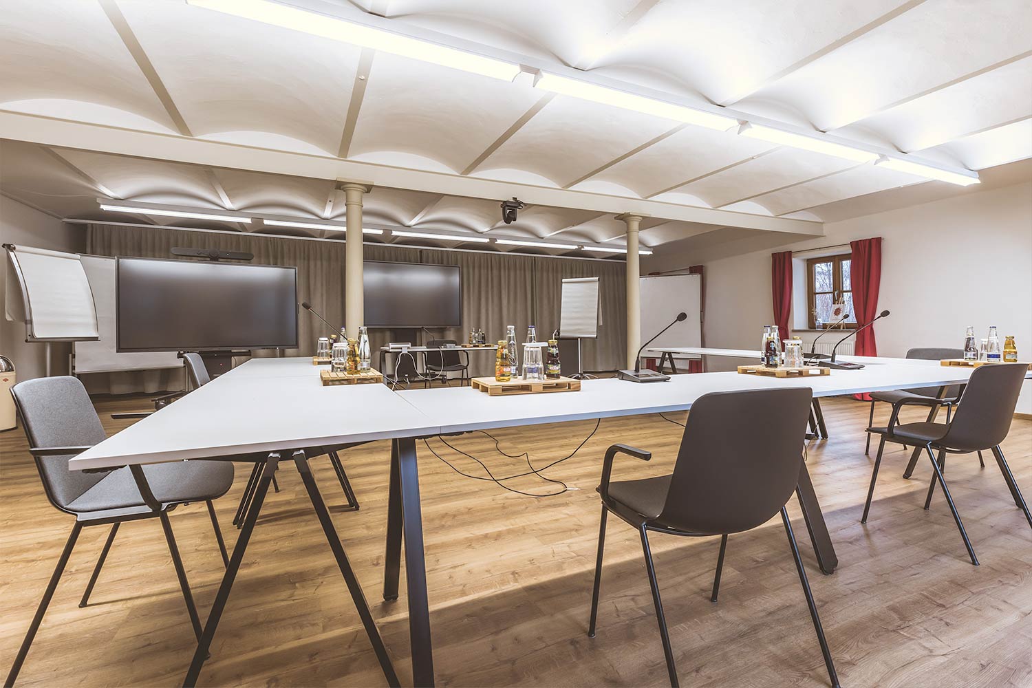 Raum-Ausstattung: 1 Flipchart (Neuland), 2 Pinnwände (Neuland), 1 Moderationskoffer, 86“ Zoll Monitor (Samsung Flip) inkl. Touchfunktion, WLAN