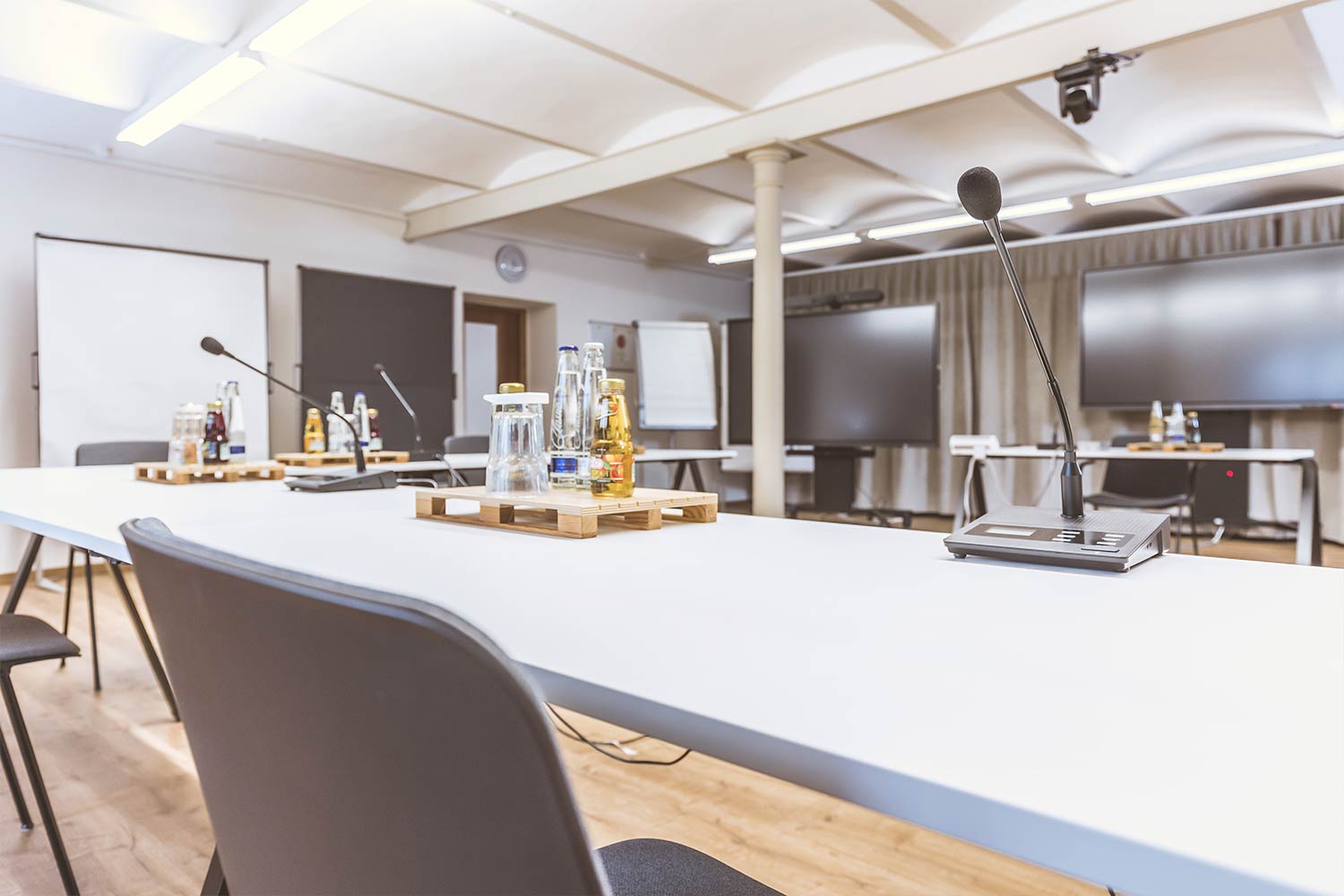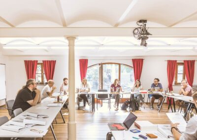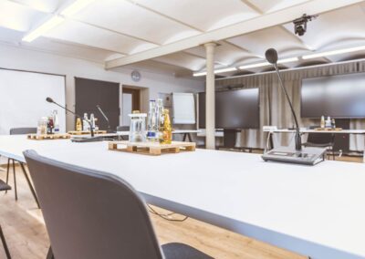 Seminarraum 5 liegt im Erdgeschoss mit Zugang zum Innenhof. Dank der umfassenden technischen Ausstattung ist der Raum für vielfältige Formate geeignet.